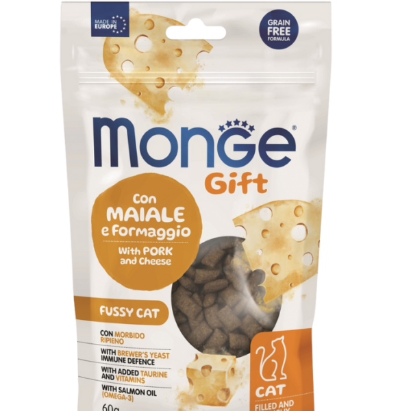 Monge, კატის სასუსნაო რბილი ჩხირები, ღორის ხორცი ასკილითა და ყველით, 15გრ
