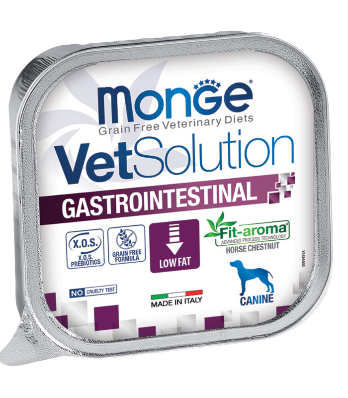 მონჯე ვეტსოლუშენი გასტროინტესტინალი (დაბალი ცხიმიანობა*) არის სრულფასოვანი საკვები ძაღლებისთვის, რომელიც შემუშავებულია ნაწლავებში აბსორბაციის (შეწოვის) დარღვევების შესამცირებლად და ცუდი მონელების კომპენსაციისთვის. შეიცავს ნუკლეოტიდებს იმუნური სისტემის მხარდასაჭერად, ცხენის წაბლს ნაწლავების მხარდასაჭერად, ქსილოოლიგოსაქარიდებს (XOS) ნაწლავის მიკრობიოტის დასაცავად. ადვილად მოსანელებელი საკვები ნატრიუმის და კალიუმის მომატებული შემცველობით.