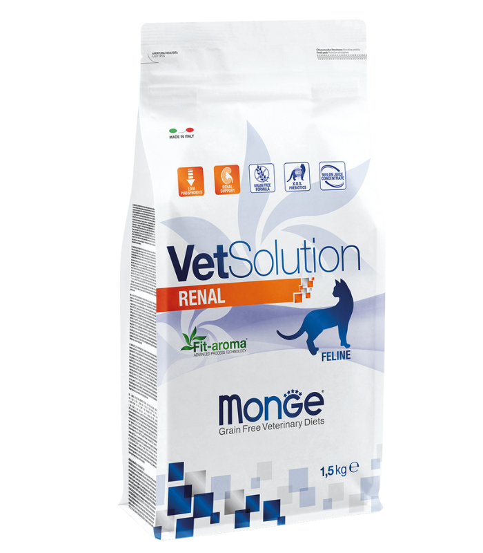 მონჯე ვეტსოლუშენი რენალი კატა არის სრულფასოვანი დიეტური საკვები კატებისთვის, რომელიც შექმნილია თირკმლის ფუნქციის მხარდასაჭერად ქრონიკული ან დროებითი თირკმლის უკმარისობის შემთხვევაში. შეიცავს ნესვის წვენის კონცენტრატს თავისუფალი რადიკალების გასანეიტრალებლად, მწვანე ჩაის თირკმელების მხარდასაჭერად და ქსილოოლიგოსაქარიდებს (XOS) ნაწლავის მიკრობიოტის დასაცავად. ფორმულა ხასიათდება მაღალი ხარისხის ცილებით და ფოსფორისა და ნედლი ცილის შეზღუდული შემცველობით.