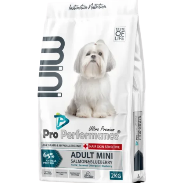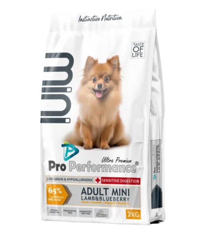 PRO PERFORMANCE Mini Adult, lamb&blueberry – ულტრა პრემიუმ ხარისხის მინი ჯიშის ზრდასრული ძაღლებისთვის განკუთვნილი საკვები ბატკნის ხორცით და მოცვით, სენსიტიური მონელების პრობლემების გადასაჭრელად.