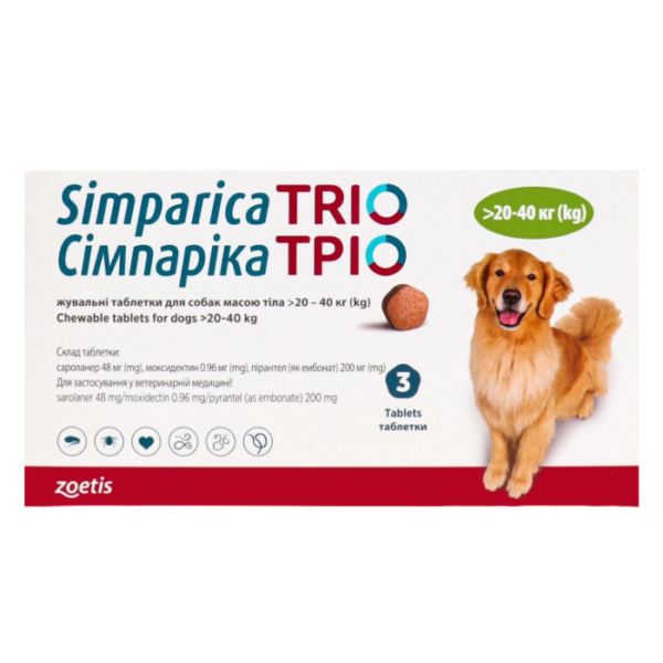 გამოიყენება ძაღლში, რომლებსაც აქვთ გარე და შიდა პარაზიტების შერეული ინვაზიები ან აქვთ ინვაზიის გაზრდილი რისკი. სიმპარიკა ტრიო გამოიყენება ერთდროულად გამოვლენილი ტკიპების, რწყილების და კუჭ-ნაწლავის ნემატოდების წინააღმდეგ. პრეპარატი ასევე გამოიყენება დიროფილარიოზის დაავადების (Dirofilaria spp.) და ანგიოსტრონგილოზის (angiostrongylus vasorum) პროფილაქტიკისთვის.
