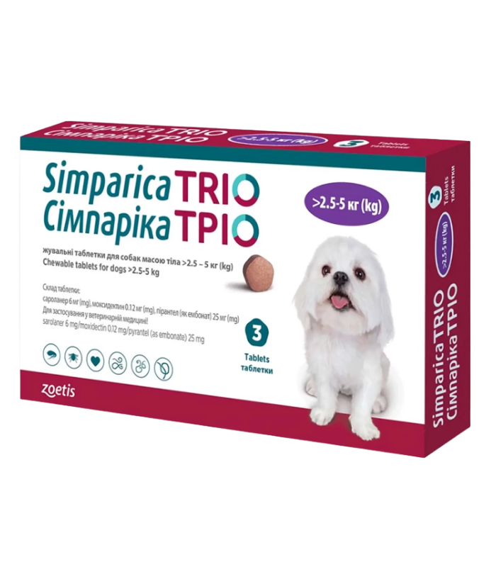 გამოიყენება ძაღლში, რომლებსაც აქვთ გარე და შიდა პარაზიტების შერეული ინვაზიები ან აქვთ ინვაზიის გაზრდილი რისკი. სიმპარიკა ტრიო გამოიყენება ერთდროულად გამოვლენილი ტკიპების, რწყილების და კუჭ-ნაწლავის ნემატოდების წინააღმდეგ. პრეპარატი ასევე გამოიყენება დიროფილარიოზის დაავადების (Dirofilaria spp.) და ანგიოსტრონგილოზის (angiostrongylus vasorum) პროფილაქტიკისთვის.